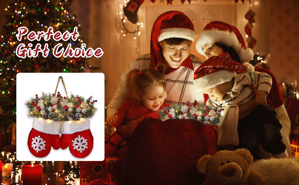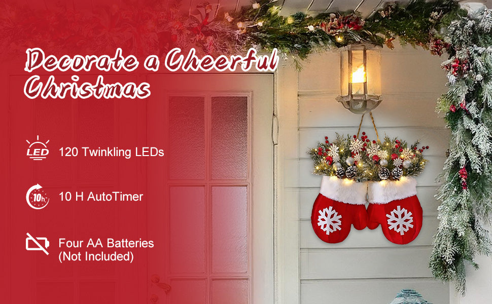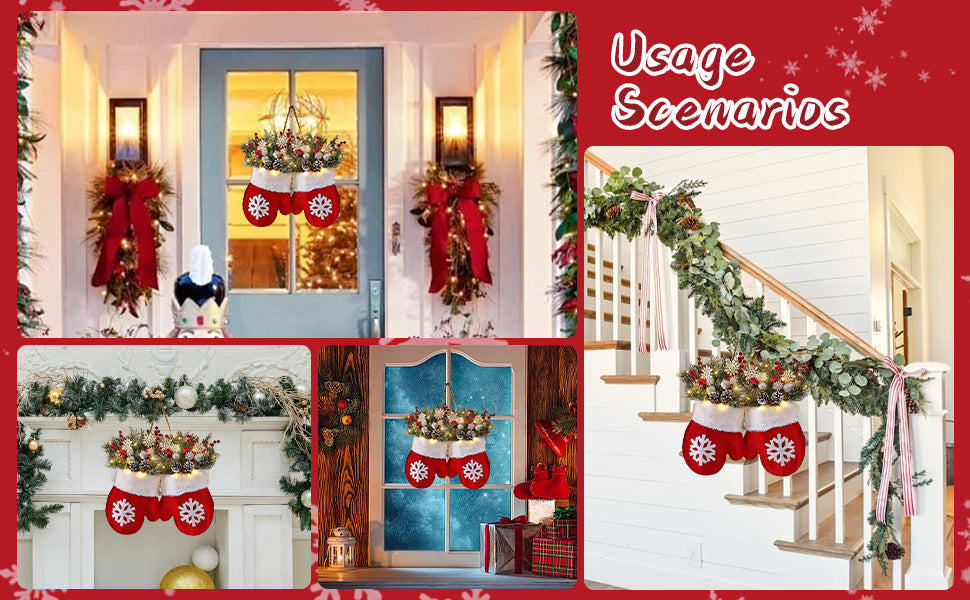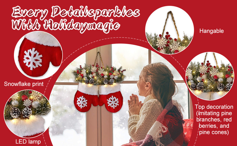 Cozy mittens, pine branches, and warm LED lights bring festive charm to any space.
